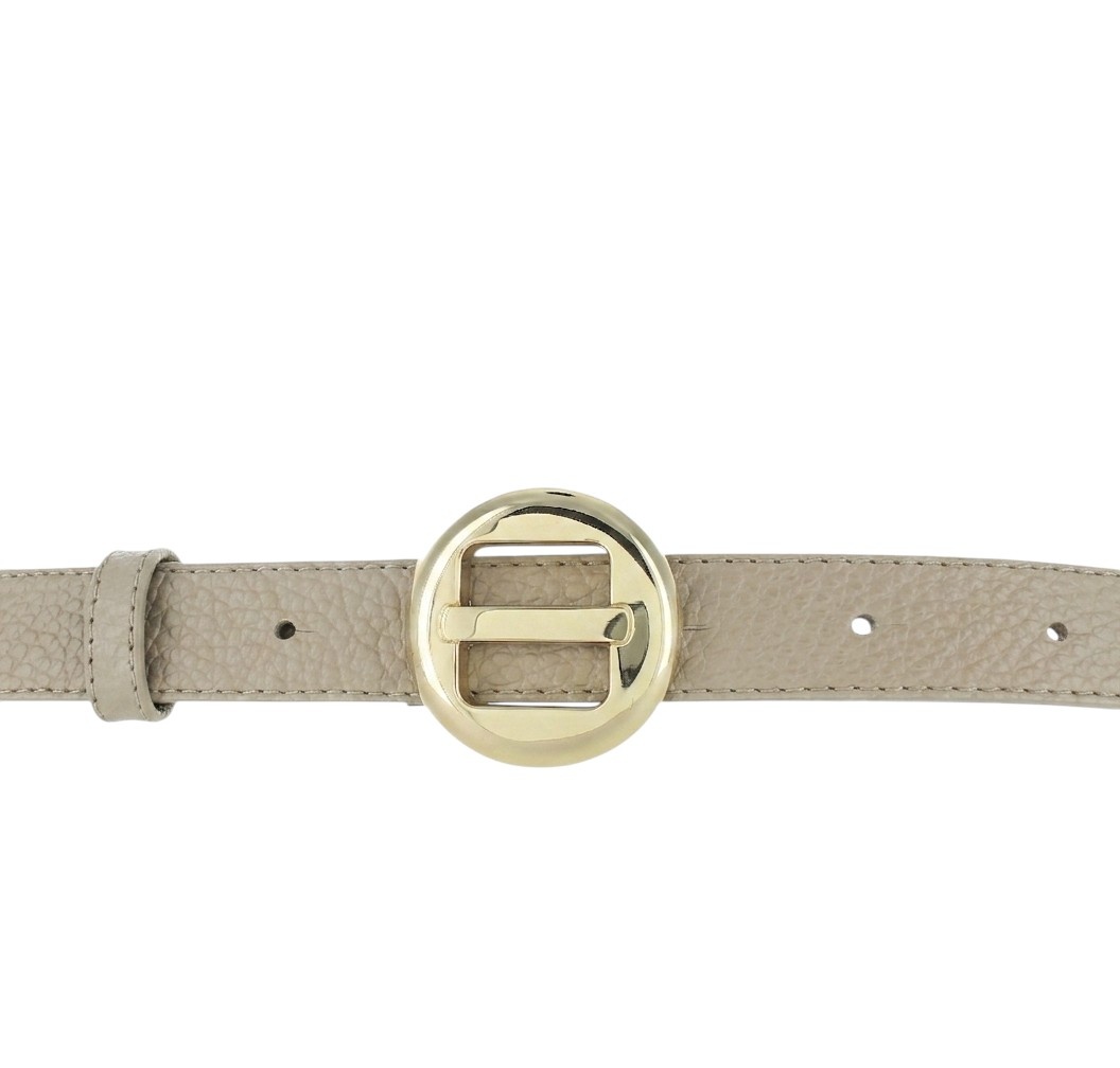 De goudkleurige, nikkelvrije gesp vormt het elegante middelpunt van de riem. Door de ronde vorm en strakke afwerking is dit een echte blikvanger die zorgt voor een chique, maar tijdloze uitstraling.