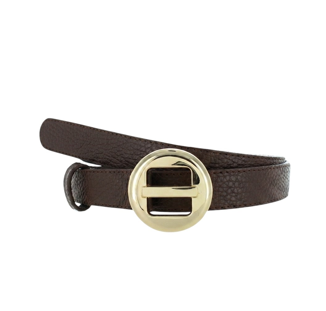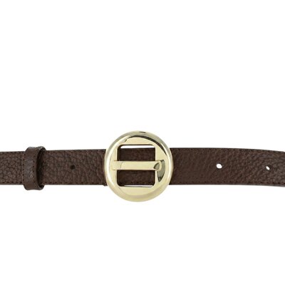 De goudkleurige, nikkelvrije gesp vormt het elegante middelpunt van de riem. Door de ronde vorm en strakke afwerking is dit een echte blikvanger die zorgt voor een chique, maar tijdloze uitstraling.