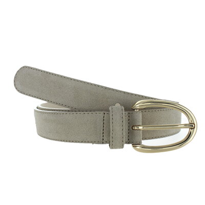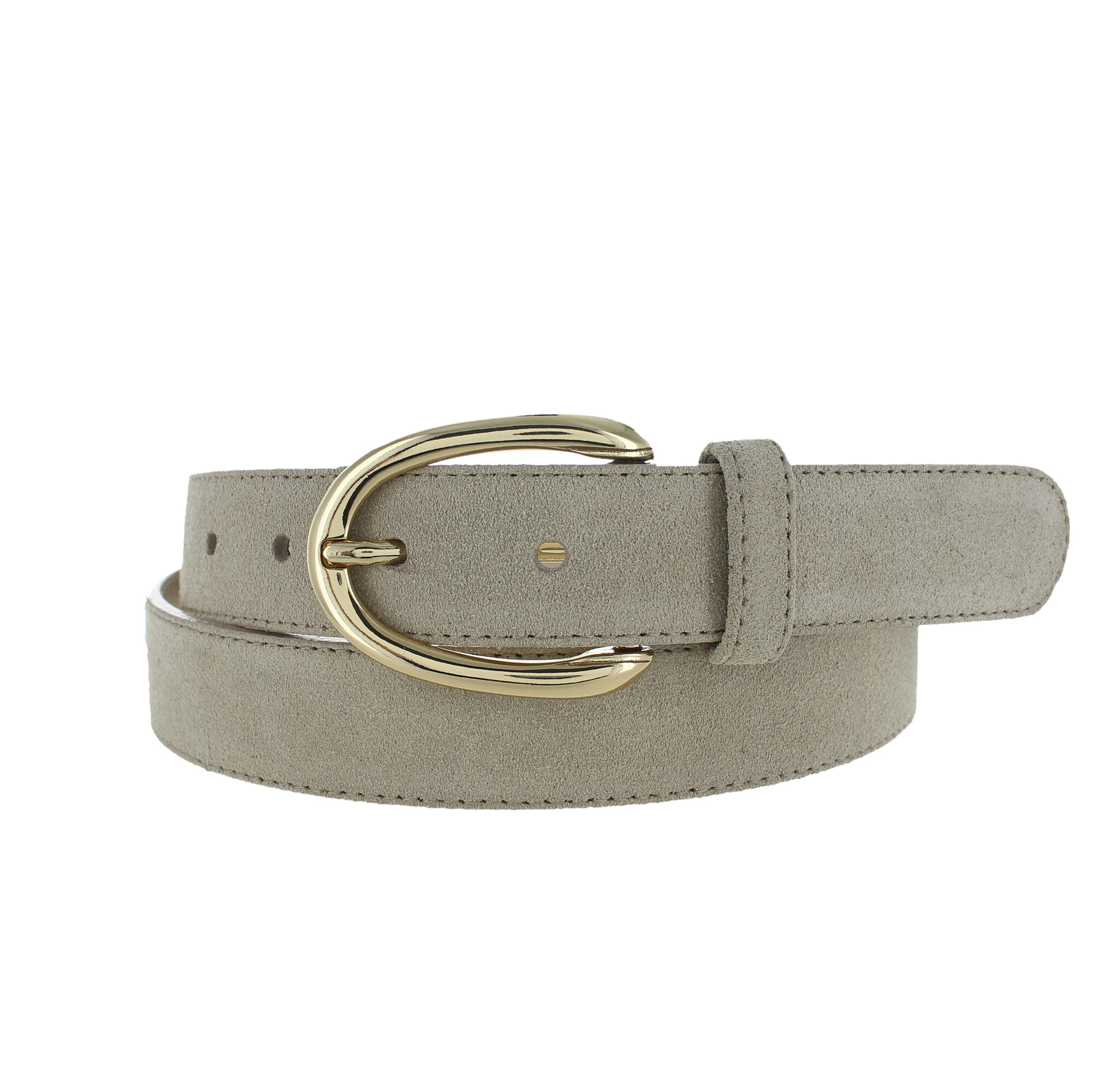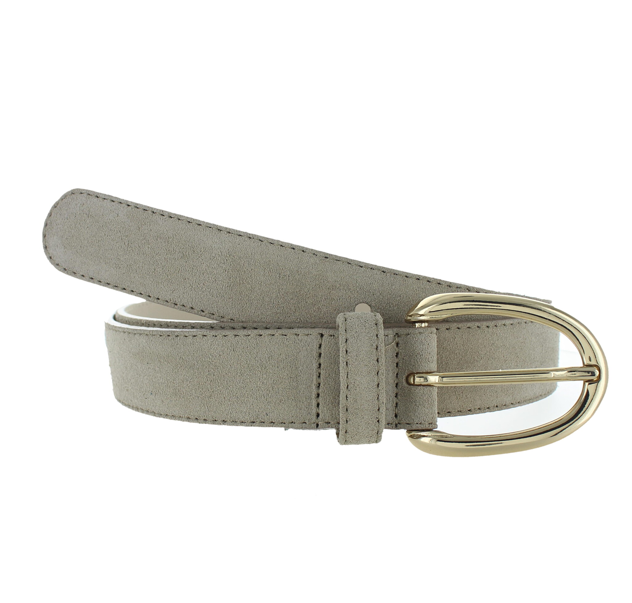 Stijlvolle suède damesriem van 3 cm breed in de kleur beige. Voorzien van een goudkleurige, nikkelvrije gesp. Het hoogwaardige suède leer voelt zacht en fluweelachtig aan en geeft de riem een luxe, matte uitstraling.