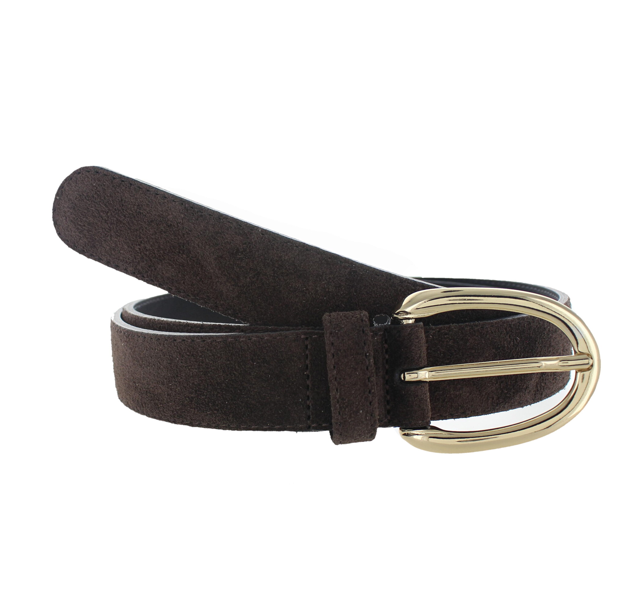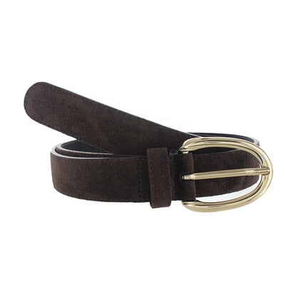 Stijlvolle suède damesriem van 3 cm breed in de kleur donkerbruin. Voorzien van een goudkleurige, nikkelvrije gesp. Het hoogwaardige suède leer voelt zacht en fluweelachtig aan en geeft de riem een luxe, matte uitstraling.