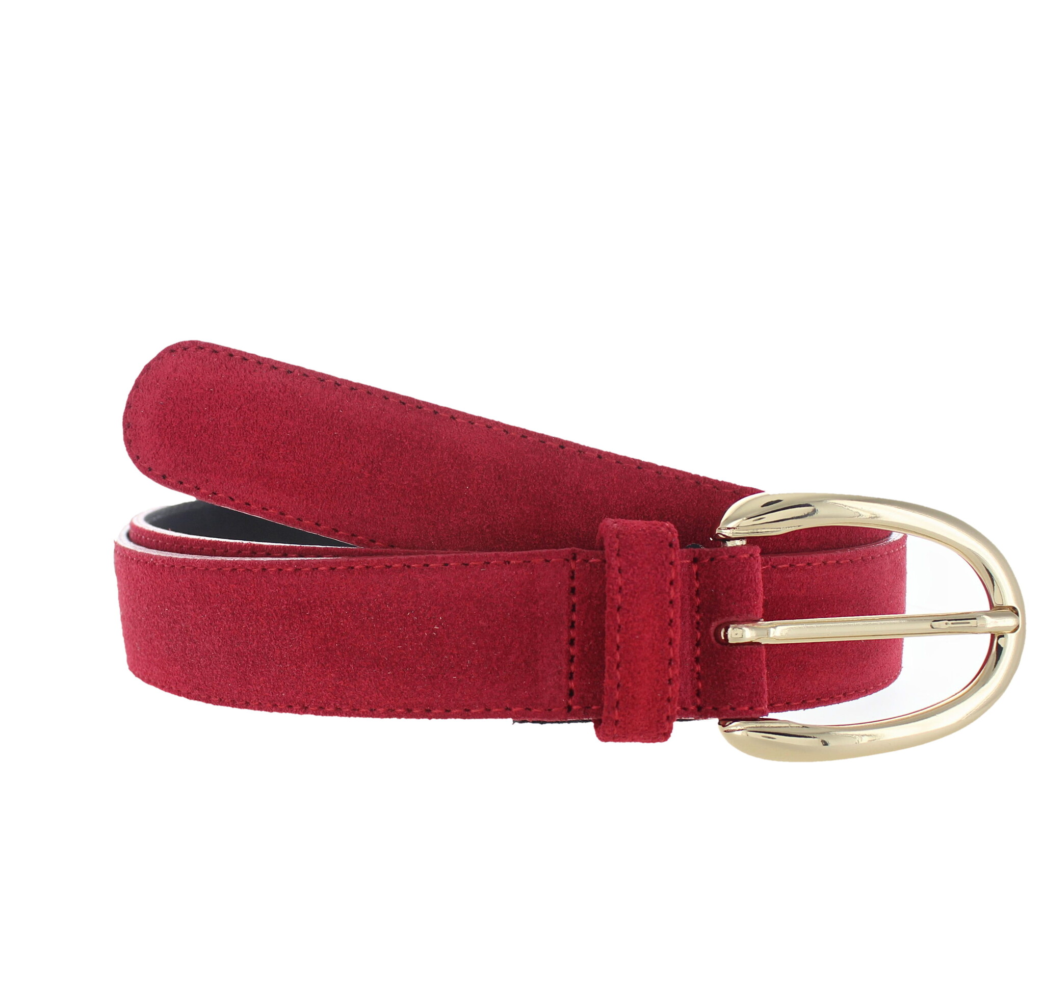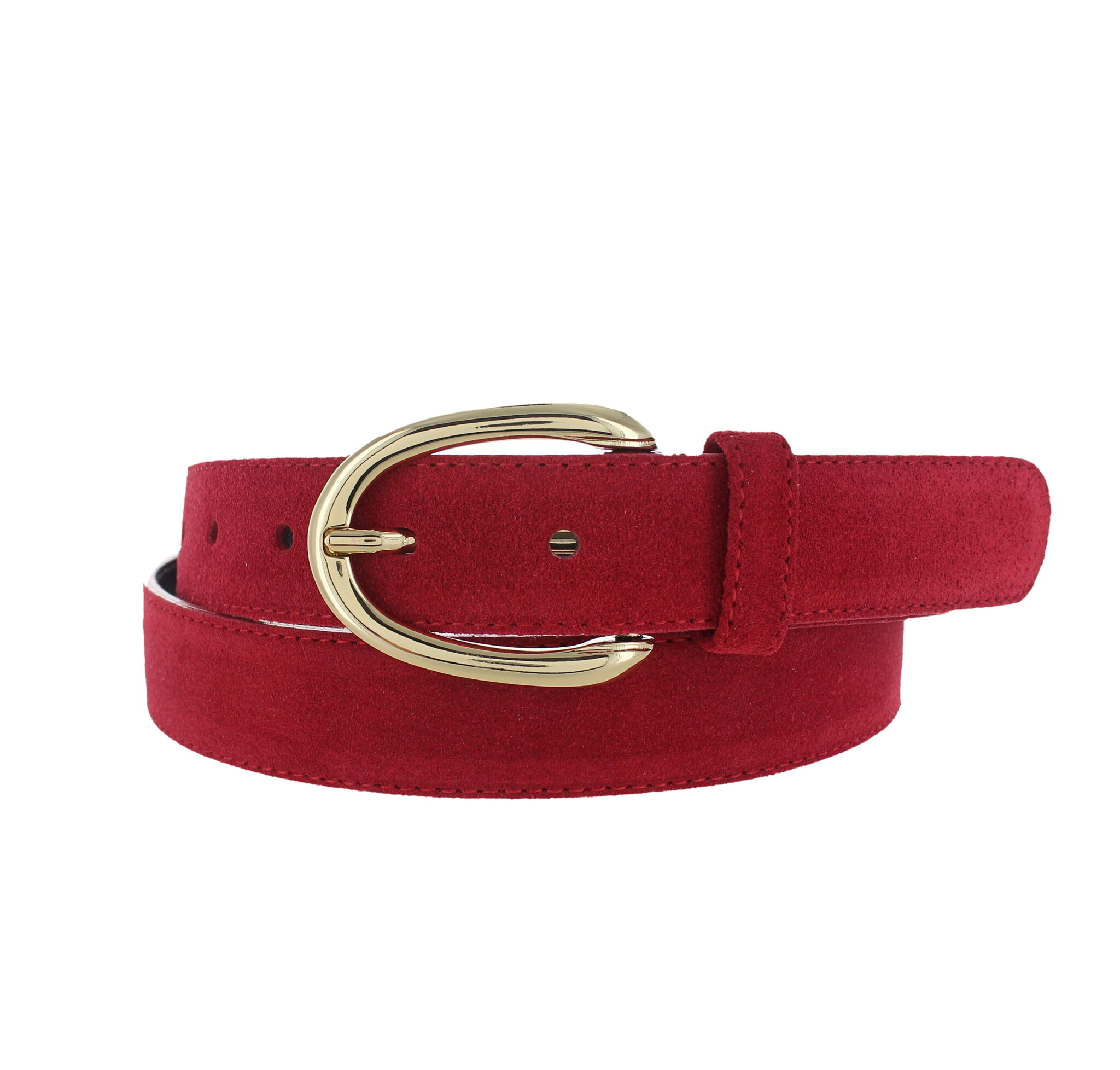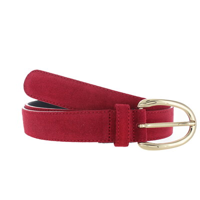 Stijlvolle suède damesriem van 3 cm breed in de kleur rood. Voorzien van een goudkleurige, nikkelvrije gesp. Het hoogwaardige suède leer voelt zacht en fluweelachtig aan en geeft de riem een luxe, matte uitstraling.