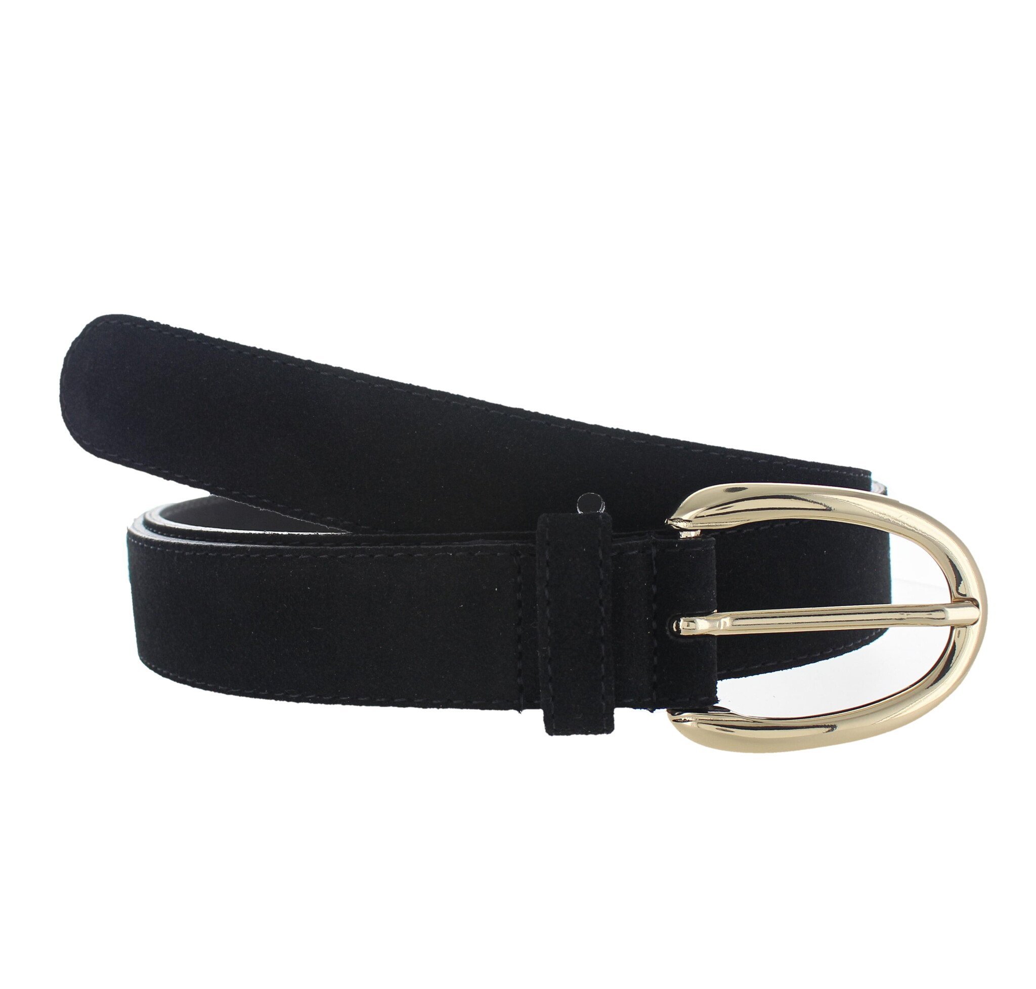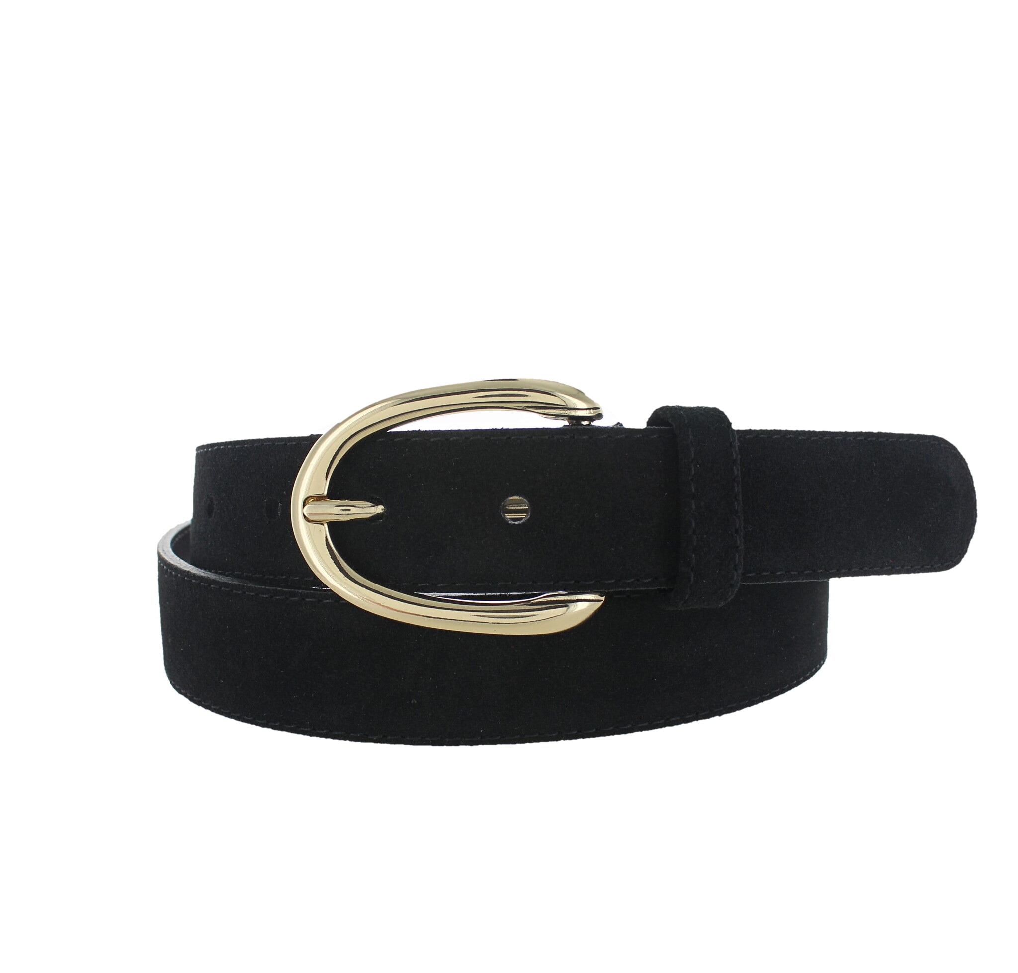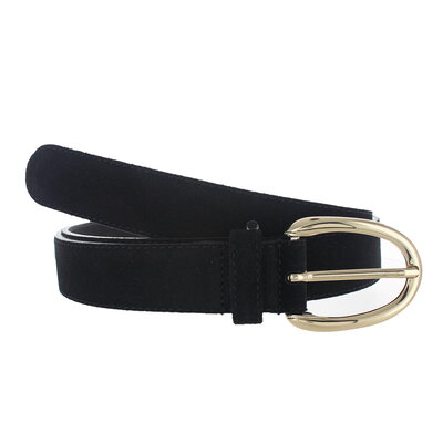 Stijlvolle suède damesriem van 3 cm breed in de kleur zwart. Voorzien van een goudkleurige, nikkelvrije gesp. Het hoogwaardige suède leer voelt zacht en fluweelachtig aan en geeft de riem een luxe, matte uitstraling.