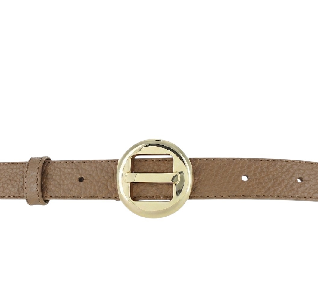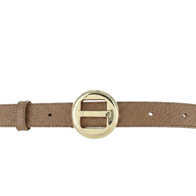 De goudkleurige, nikkelvrije gesp vormt het elegante middelpunt van de riem. Door de ronde vorm en strakke afwerking is dit een echte blikvanger die zorgt voor een chique, maar tijdloze uitstraling.