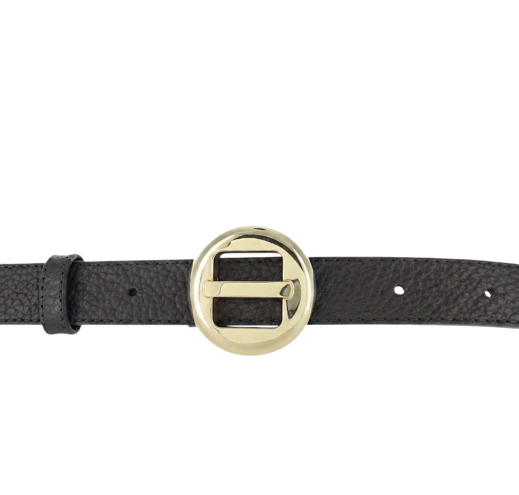 De goudkleurige, nikkelvrije gesp vormt het elegante middelpunt van de riem. Door de ronde vorm en strakke afwerking is dit een echte blikvanger die zorgt voor een chique, maar tijdloze uitstraling.
